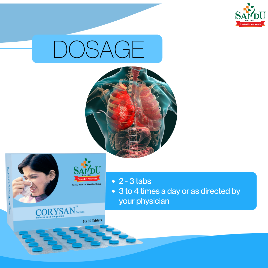Sandu Corysan tablets help to improve immunity and provide relief from common cold and flu symptoms. Inhibits excessive production of mucus and expels it from the Nose and pharyngeal region helps to clean the respiratory tract. Kiratatikta & Guduchi help to improve immunity and reduce inflammation. Kalmegh is an expectorant thus promoting mucus discharge from the upper respiratory tract. Provides effective relief from common cold & flu symptoms. Relieves headache, body pain, and associated fatigue.